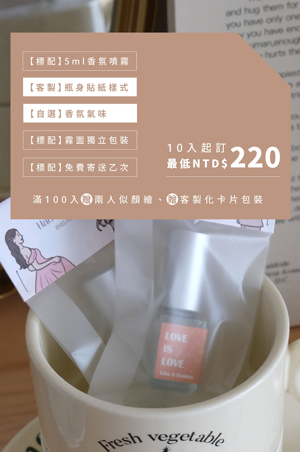10瓶以上即可訂製,100瓶以上贈送似顏繪插畫乙款+客製化小卡包裝