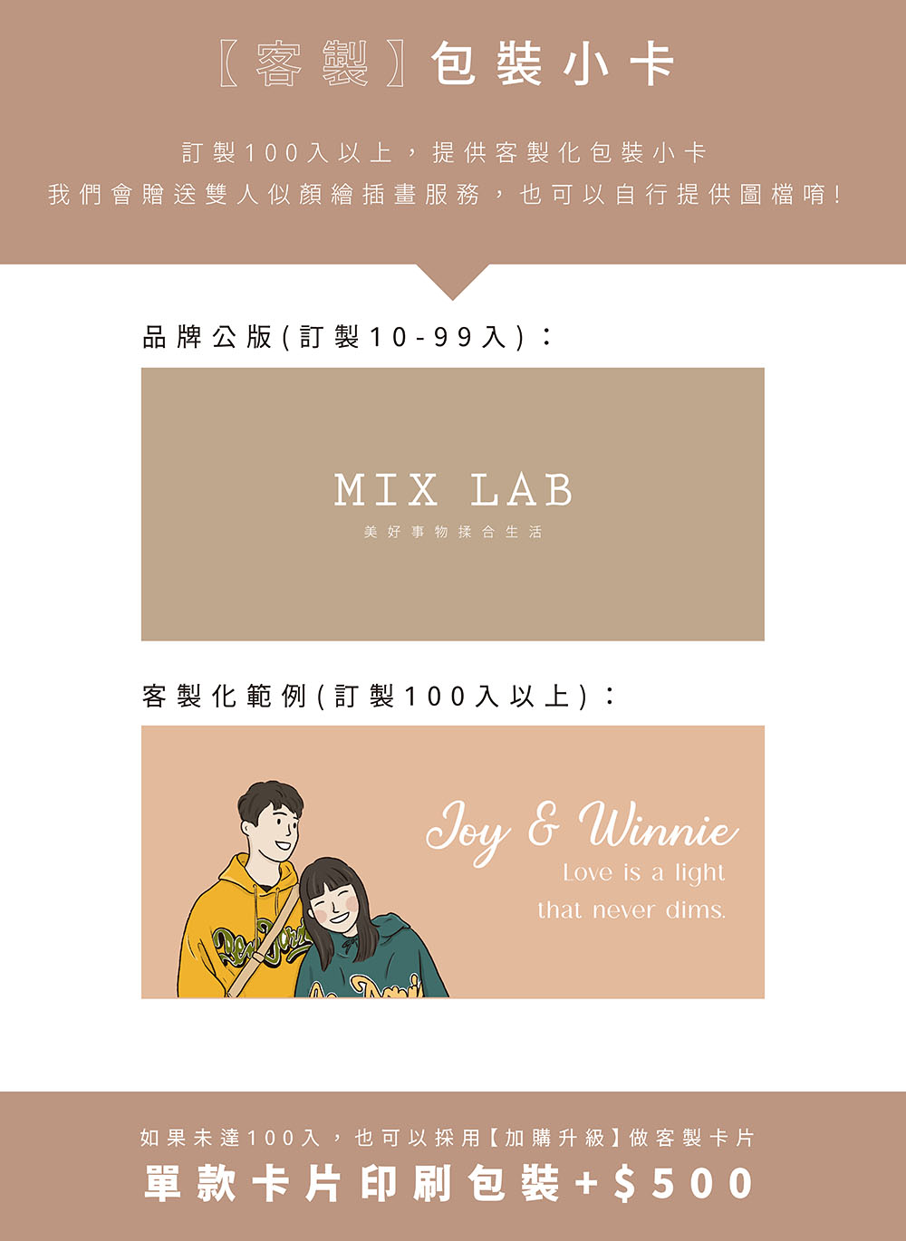 A4. 可以唷~如果未滿100入訂製,可以加購客製化標籤卡:【自行提供排版完成的圖檔】加價$350;【由MIX LAB似顏繪插畫+排版】加價$1,350,可私訊我們開立專屬賣場。
