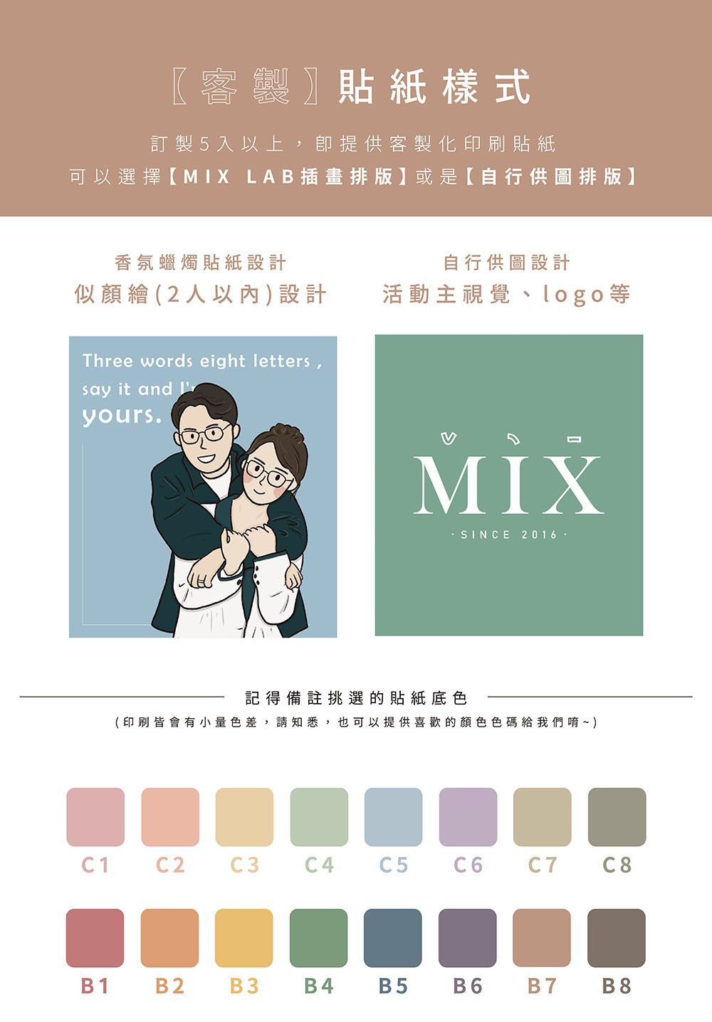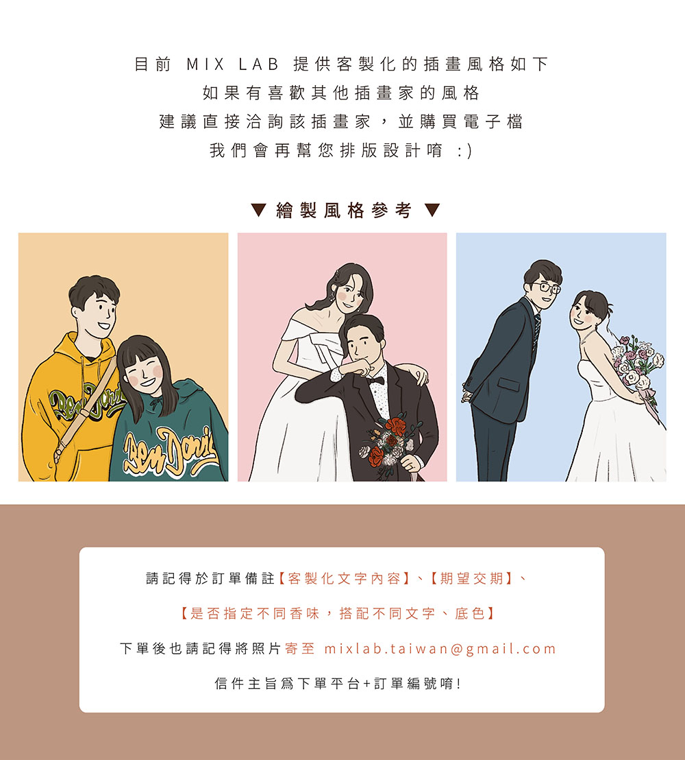 喜歡客製化貼紙的話,可提供 MIX LAB 一張想要繪製的照片(限2人以下)、簡短文案