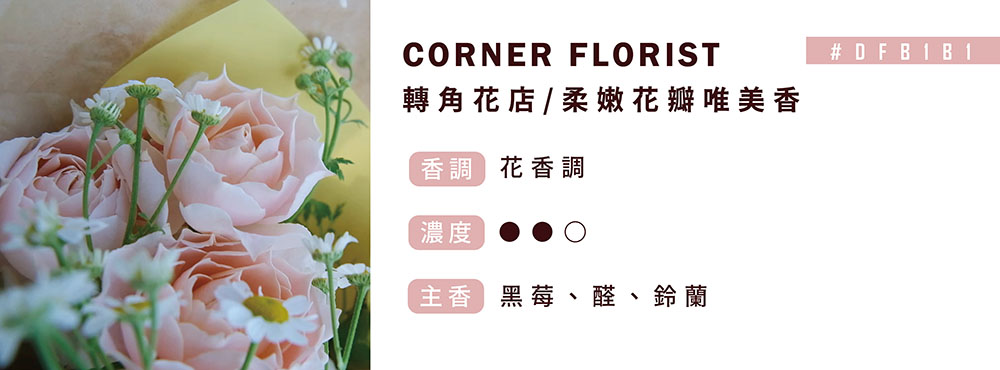 「轉角花店,採以醛香與花香為主調,營造鮮花乾淨而柔美的氣息,尾韻的岩蘭草與雪松沉穩剛毅,營造柔而不弱的香氣形象。