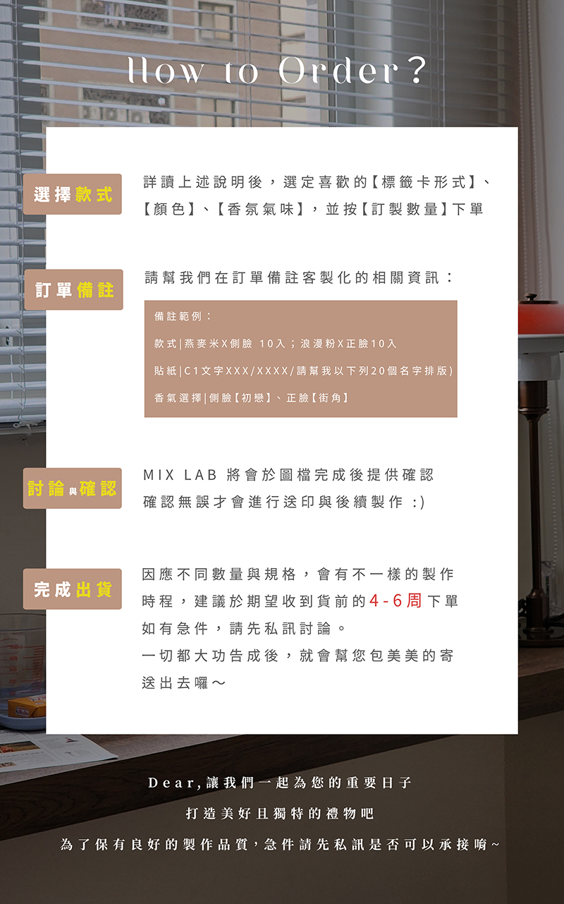 製作時程會因數量而有所不同,為了確保充裕的討論時間、製作時程,少量建議預留【2-3周】,超過50入則建議【預留4-6周】時間提前下單哦~