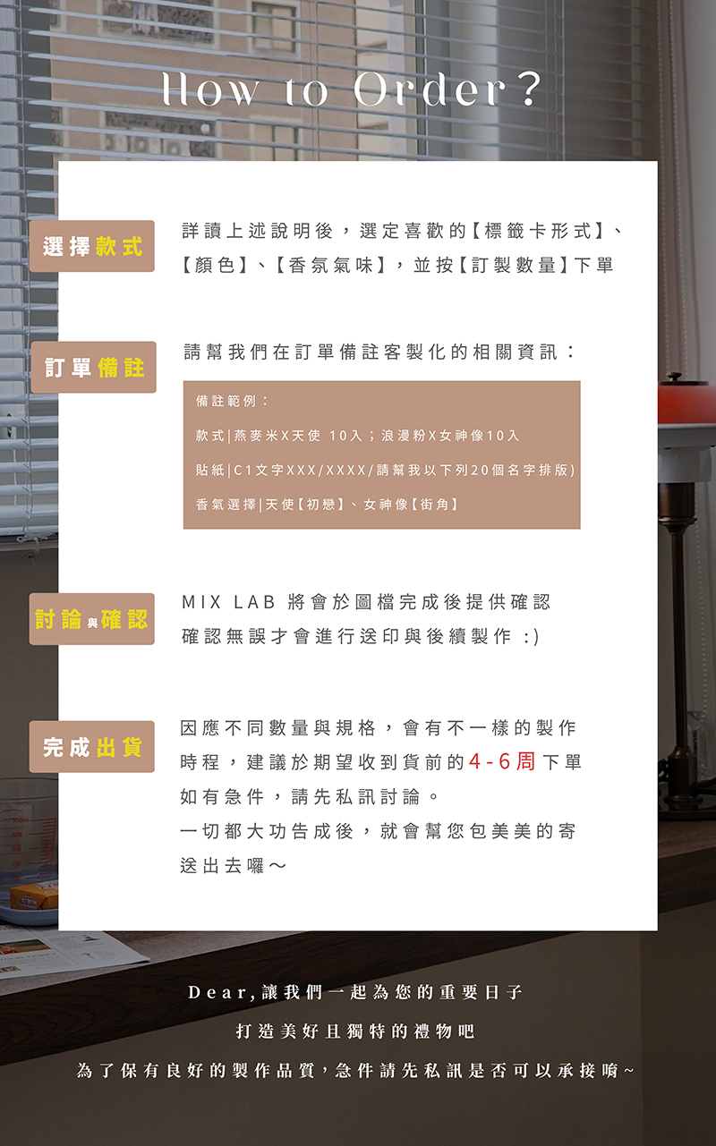 製作時程會因數量而有所不同,為了確保充裕的討論時間、製作時程,少量建議預留【2-3周】,超過50入則建議【預留4-6周】時間提前下單哦~