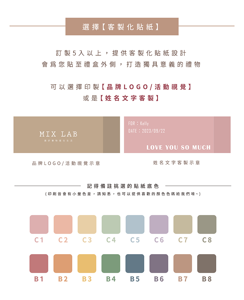 外盒可以客製化您們的姓名、活動視覺、LOGO等貼紙標籤