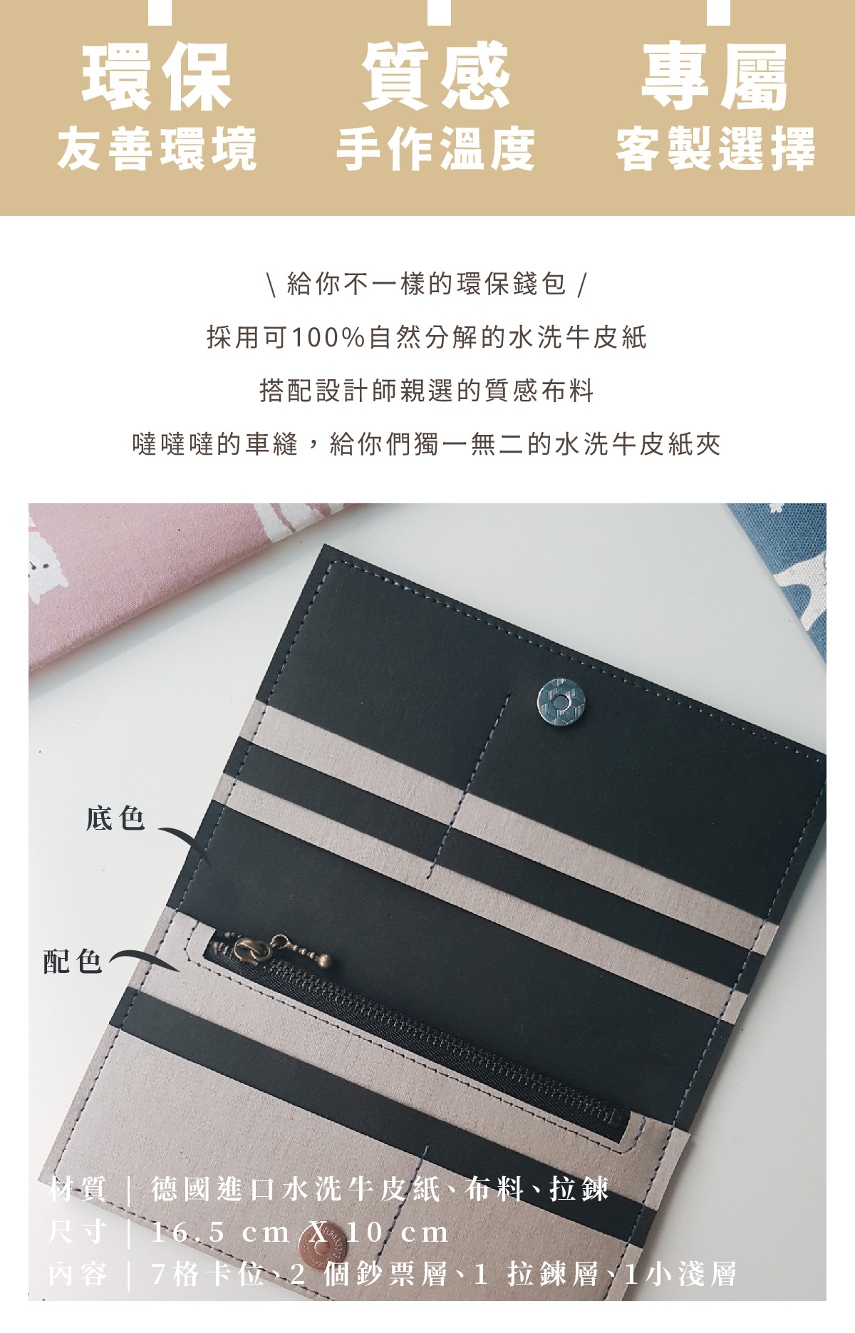 材質:德國進口水洗牛皮紙、拉鍊