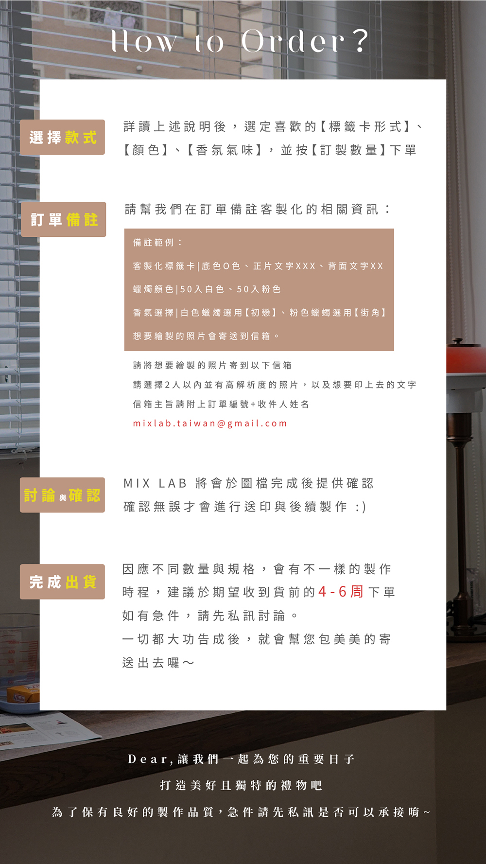 A4. 可以唷~如果未滿100入訂製,可以加購客製化標籤卡:【自行提供排版完成的圖檔】加價$350;【由MIX LAB似顏繪插畫+排版】加價$1,350,可私訊我們開立專屬賣場。