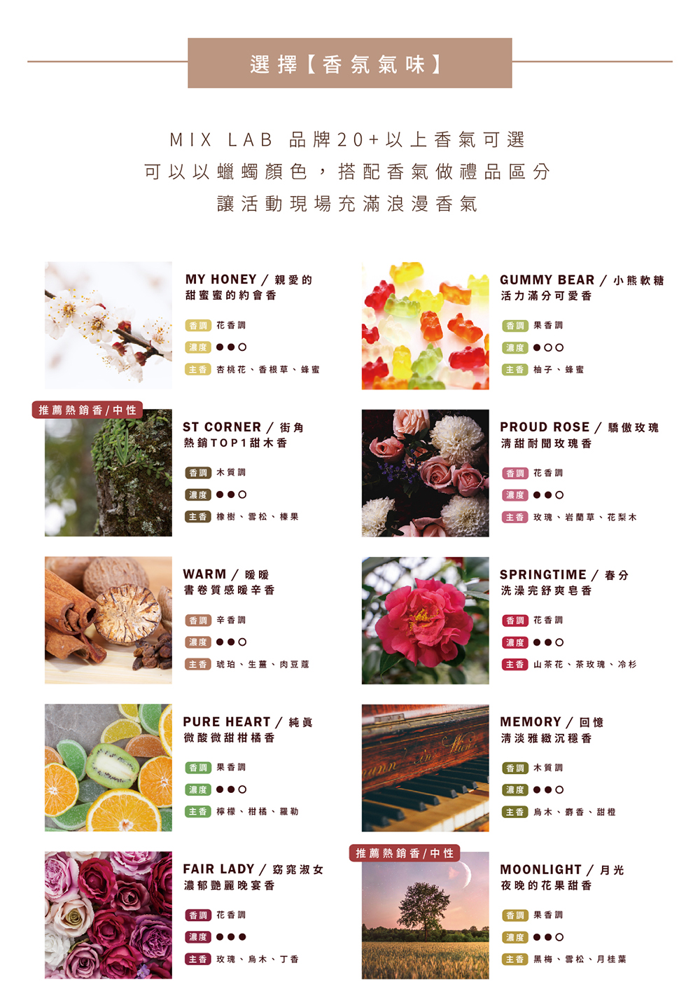 除了【客製化標籤卡】,還有品牌調香的【20款以上香氣】可選
