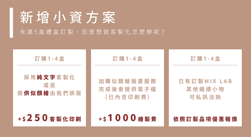 經過許多新人許願,我們終於推出1-4盒的小量客製方案!