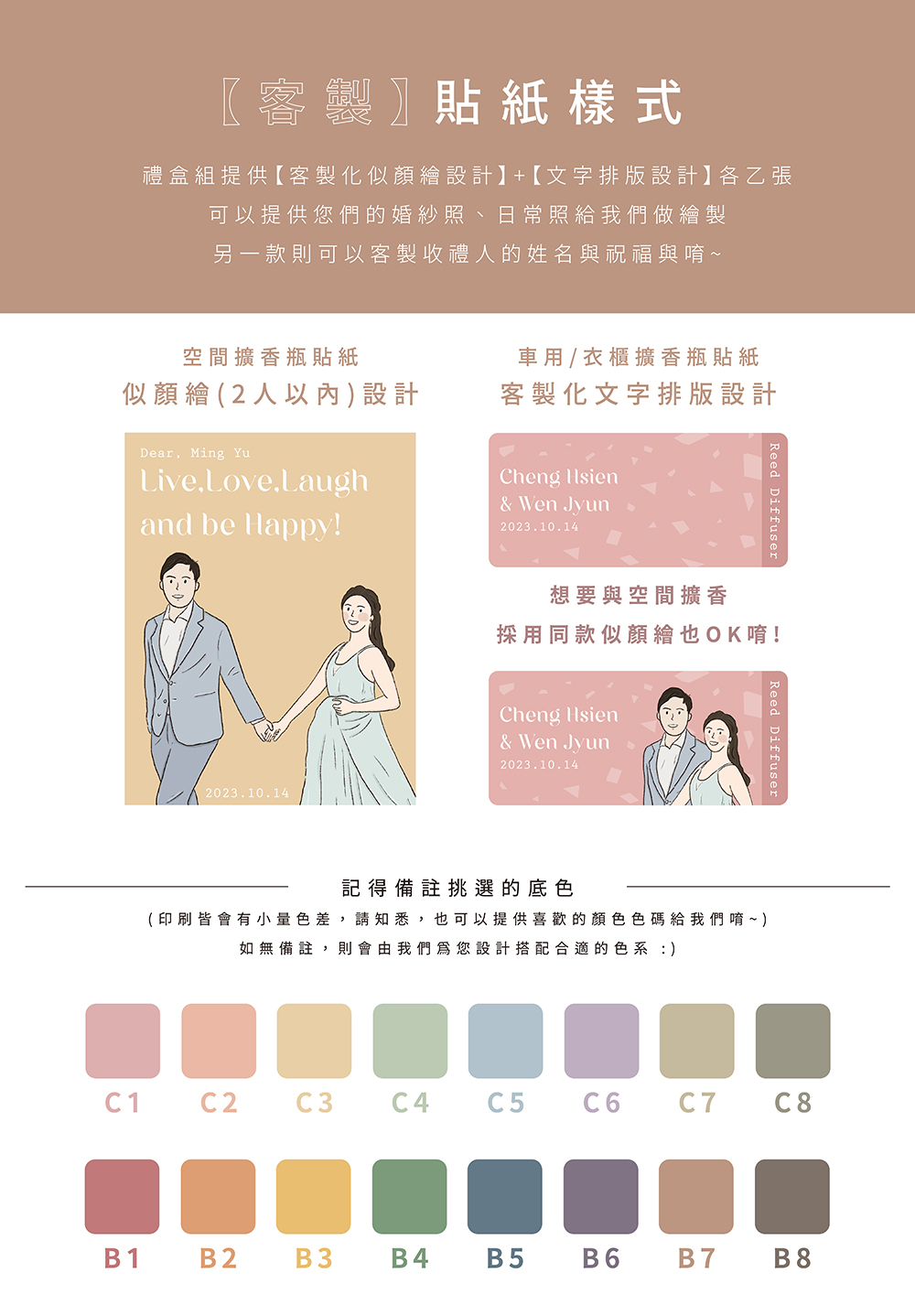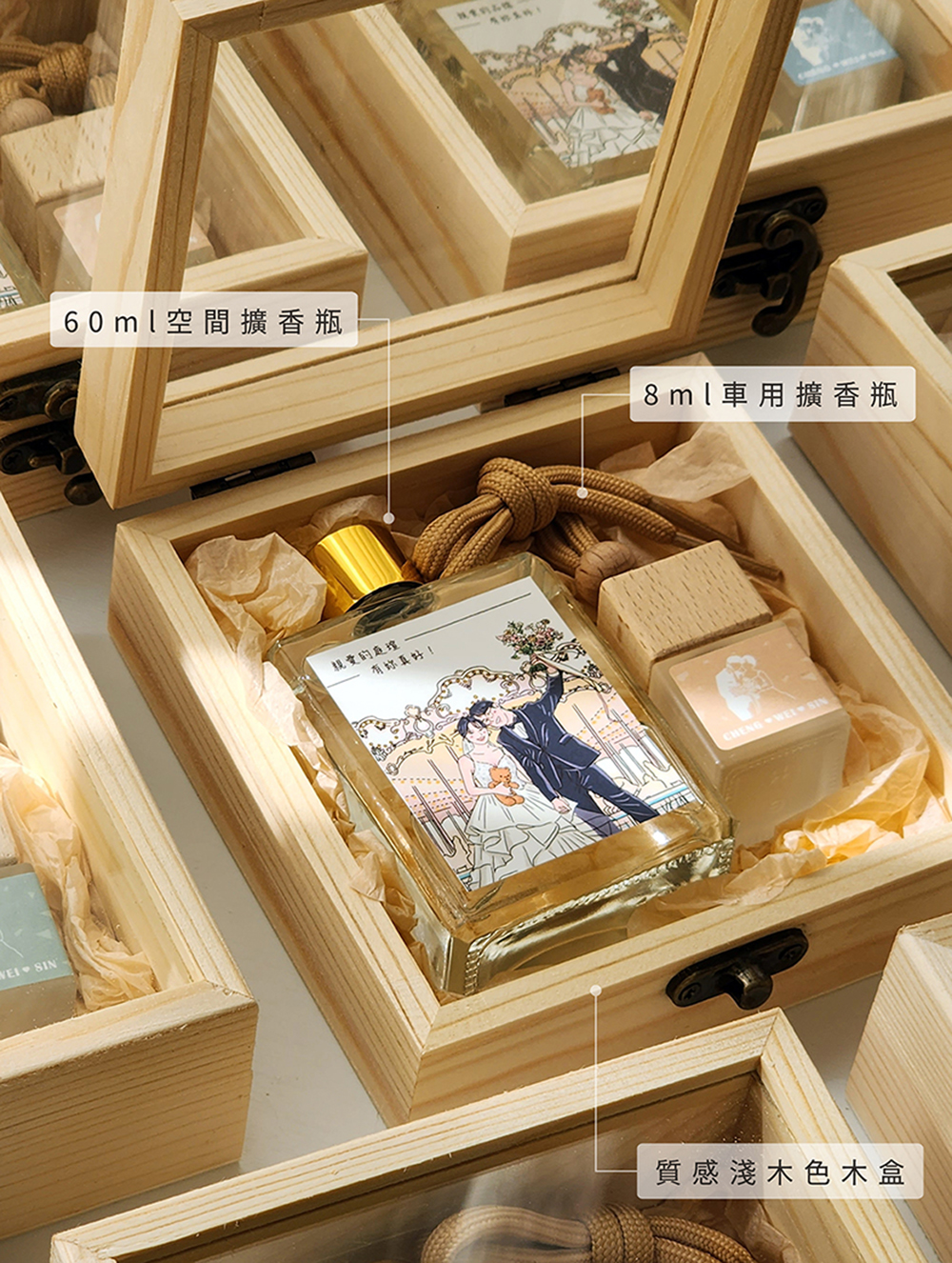 下單標配的內容有:【60ml擴香瓶】+【8ml車用擴香瓶】+【客製插畫2人】+【質感木禮盒】+【免運乙次】